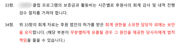 또한 '34항'에서는 회계 관련 사항에 대해 후원 법인의 허가를 받은 회계 권한을 소유한 담당자 외에는 보안을 유지해야 하며 관련 내용이 무분별하게 유출될 경우 당사자에게 법적 책임을 묻겠다고 명시했다. 1인당 52~67만 원에 이르는 연합동아리 활동비를 후원사가 정한 연합동아리 내 담당자가 회계하고, 그 감사를 동일한 후원사에서 진행하는 구조나 다름없다.