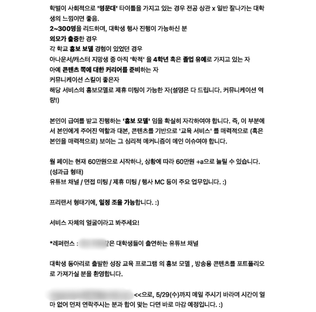 공고 내용은 일반적인 아르바이트 모집과 거리가 멀었다. 해당 구인글에서는 우대사항으로 '학벌이 사회적으로 명문대 타이틀을 가지고 있는 경우', '전공 상관 x, 일반 잘나가는 대학생의 느낌이면 좋음', '각 학교 홍보 모델 경험이 있는 경우', '아나운서/캐스터 지망생 중 아직 4학년 혹은 졸업 유예인 자' 등을 제시했다.
