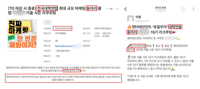 유튜브 채널 출연·면접 미팅·제휴 미팅·행사 MC까지, 구인글이 제시한 주요 업무는 3개 연합동아리 회장의 업무와 일치했다. 각 회장은 월 60만 원의 급여를 받으며, 성과급 형태로 급여가 추가될 수 있다는 언급도 있었다.