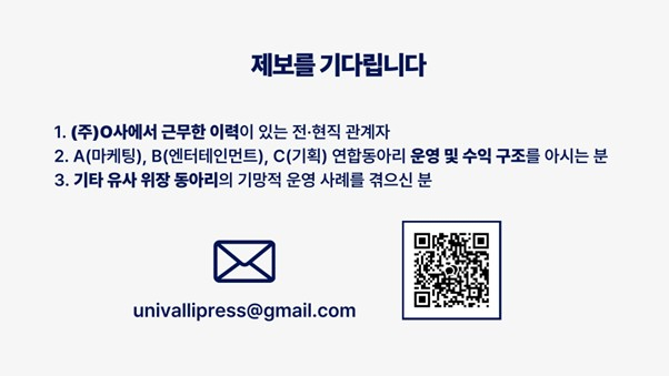 '가짜 동아리 배후기업'에 대해 추가적인 사실을 알고계시는 분들의 제보를 기다립니다.