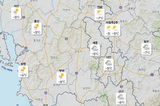 이날 낮 최고기온은 대전·천안 -1도, 세종·청주 0도로 예보됐으며 아침 최저기온은 -7도로 전날보다 6도가량 오르겠다.