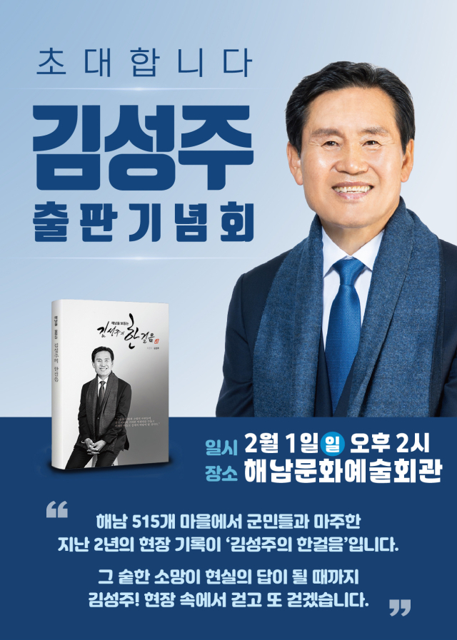 6·3지방선거에서 해남군수에 도전하는 김성주 전 해남군수협 조합장이 오는 2월 1일 해남문화예술회관에서 출판기념회를 개최한다.