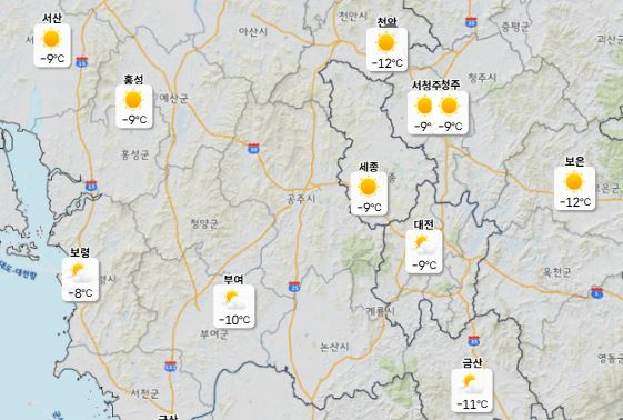 이날 낮 최고기온은 대전·청주 -1도, 세종 0도, 천안 -2도로 예보됐으며 아침 최저기온은 -12도까지 떨어질 것으로 예상된다.