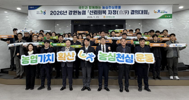 농협중앙회 강원본부(본부장 김병용)는 28일 강원본부 5층 대회의실에서 “대국민 신뢰회복과 임직원 윤리의식 쇄신”에 앞장 설 것을 다짐하는 ‘신뢰회복 자정(自淨) 결의대회’를 개최했다고 밝혔다.