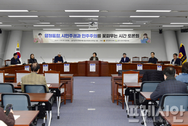 광주광역시의회는 28일 광주시민단체협의회와 공동으로 시의회 5층 예산결산특별위원회 회의실에서 '행정통합, 시민주권과 민주주의를 꽃피우는 시간 토론회'를 개최했다.
