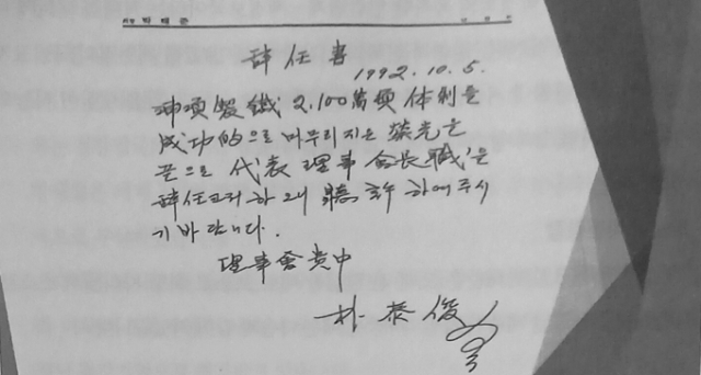 한편, 이 책의 끝에는 1992년 10월 5일 박태준 회장이 포스코 이사회에 제출한 ‘사임서’, 임직원들의 ‘철회 건의문’, 그의 ‘반려 이유’ 등이 특별자료로 첨부돼 있다. 그때 회장직에서 스스로 물러난 그는 자진사퇴의 뜻을 굽힐 수 없는 이유를 육필 메모로 이렇게 털어놓았다.