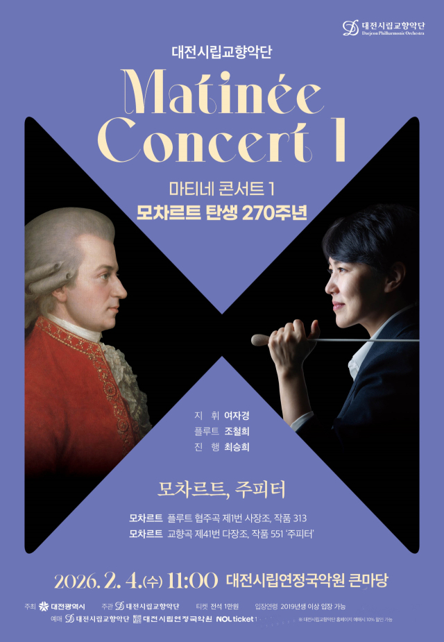 티켓은 2월3일 오후 5시까지 대전시립교향악단 홈페이지와 대전시립연정국악원, NOL티켓을 통해 예매할 수 있다.