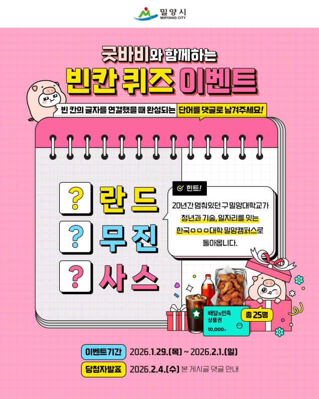 밀양시는 한국폴리텍대학 밀양캠퍼스 건립 사업비가 최종 확정됨에 따라 이번 사업이 지역에 가져올 긍정적인 변화를 알리고자 1월 29일부터 2월 1일까지 시 공식 인스타그램을 통해 '빈칸 채우기 온라인 이벤트'를 진행한다.