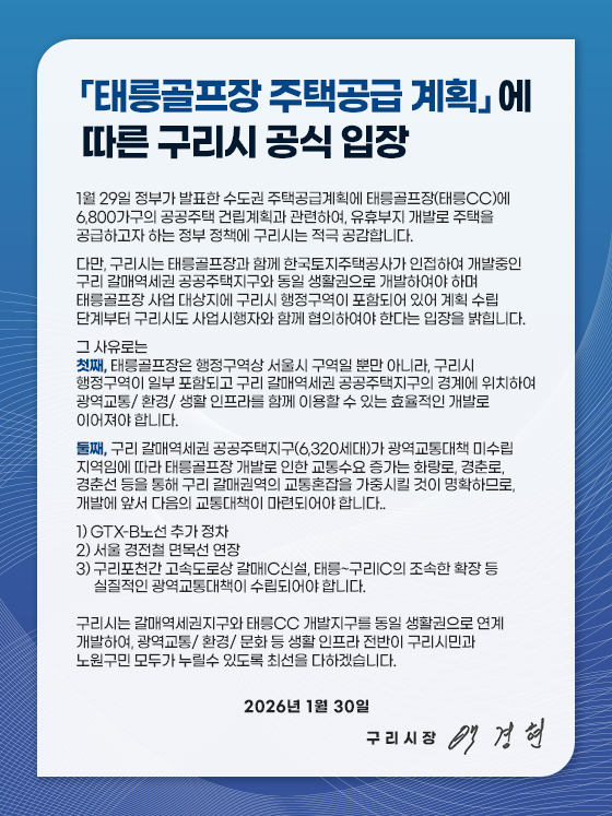 구리시는 정부가 발표한 수도권 주택공급계획에 태릉골프장에 6800가구의 공공주택 건립이 포함된 것과 관련해 30일, 태릉골프장과 인접해 있는 구리 갈매역세권 공공주택지구도 동일 생활권으로 개발해야 한다는 입장을 밝혔다.