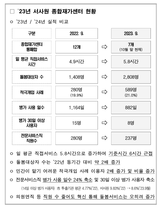 그럼에도 서울시는 적극개입의 정의·난이도·운영 비용·노동 강도 등에 대한 설명 없이 적극개입의 의미를 지운 채, 비율이라는 숫자 하나로 '실적 저조'라는 낙인을 찍었다. 심지어 어떤 기준으로 저조하다고 판단했는지조차 제시하지 못했다. 기준 없는 평가는 평가가 아니라 낙인이다. 적극개입 사례는 비중이 아니라 절대 규모, 난이도, 증가 추세 등으로 평가돼야 한다. 실제로 서사원의 적극개입 사례는 충원되지 않고 감소하고 있는 인력 규모 대비, 지속적으로 증가해 왔고, 이는 공공이 감당해야 할 고난도·복합 돌봄을 점차 확대해 왔다는 것을 보여준다.