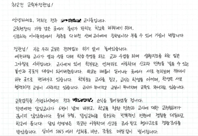 교사들은 전북교육청에 보내는 손 편지에서 "그 두 아이 가운데 한 명이 출석일수 부족으로 졸업을 하지 못하고 유급됐는데, 올해 역시 6학년 담임은 악성민원에 시달릴 가능성이 높다"면서 "교육청에서 장학관이나 장학사를 임시 담임교사로 배치해 악성민원 발생 시 교육청 차원의 신속한 대처가 필요하다"고 강조했다.