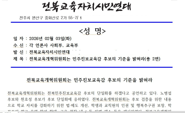 전북교육자치시민연대는 3일 "전북교육개혁위원회는 민주진보교육감 후보의 기준을 밝힐 것"을 요구하는 성명을 내고 "먼저, 민주진보 후보의 기준은 무엇"인지를 물었다.