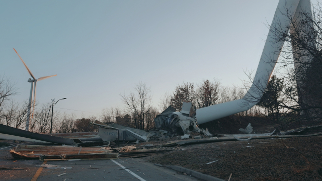사고 당시 높이 약 80미터에 달하는 타워와 블레이드가 지면으로 떨어지면서 일부 파편이 인근 도로로 튀는 상황이 발생했다.