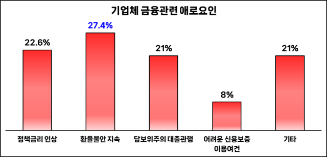기업들이 체감하는 금융 부담 요인으로는 환율 불안 지속(27.4%)이 가장 크게 나타났고, 이어 정책금리 인상(22.6%), 담보 위주의 대출 관행과 기타 요인(각 21%), 신용보증 이용 여건의 어려움(8%) 순으로 조사됐다.