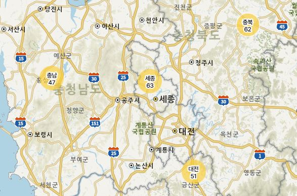 ▲충청권 5일 오전 11시 기준 미세먼지 농도 ⓒ에어코리아