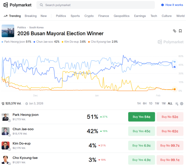 미국의 블록체인 기반 예측플랫폼 '폴리마켓'이 6·3 지방선거에서 박형준 부산시장의 당선을 전망했다. 폴리마켓은 앞서 전재수 더불어민주당 의원의 당선을 전망하기도 해 지방선거 마지막까지 예측불허의 전개가 이어질 것으로 보여진다.