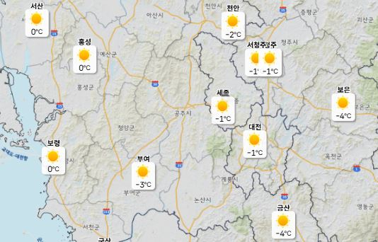 이날 낮 최고기온은 대전 11도, 세종·청주·천안 13도, 아침 최저기온은 -2도 안팎으로 예보됐다.