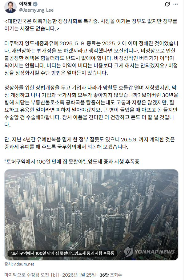 가장 파장이 큰 의제는 부동산이었다. 다주택자 양도소득세 중과 유예 종료에 대한 부정적 여론이 퍼지자 이 대통령은 직접 여론전에 '참전'했다. 그는 지난달 "버티는 이익이 버티는 비용보다 크게 해서는 안되겠다"며 "시장을 이기는 정부도 없지만 정부를 이기는 시장도 없다"고 공언했다. "팔면서 내는 세금보다 들고 버티는 세금이 더 비싸도 그렇게 할 수 있을까", "이번이 마지막 기회였음을 곧 알게 될 것"이라고도 했다. 시장에서는 이 대통령의 경고를 '추가 규제 신호'로 해석하며 각종 전망이 나돌기도 했다.