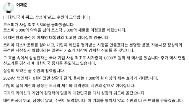 그는 "코리아 디스카운트를 걷어내고, 기업이 제값을 평가받는 시장을 만들겠다는 분명한 방향을 비롯해 자본시장 정상화와 공정한 시장질서 확립이라는 일관된 기조가 시장에 강력한 신뢰를 준 것"이라고 설명했다.
