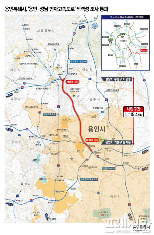 실제 ‘용인~성남 고속도로’는 처인구 포곡읍 마성리(영동고속도로)에서 동백동과 구성동 및 모현읍을 거쳐 성남시 수정구 사송동(수도권제1순환고속도로)까지 15.4㎞ 구간으로 추진되고 있다.