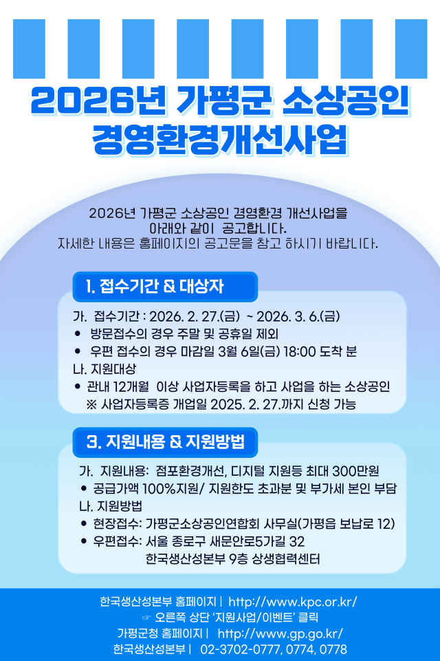 가평군은 한국생산성본부와의 업무 협약을 바탕으로 ‘2026년 가평군 소상공인 경영환경개선사업’ 대상자를 3월 6일까지 모집한다고 밝혔다.