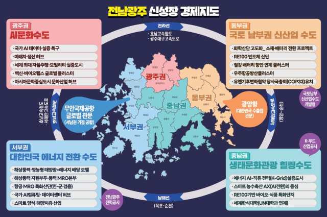 이날 제시된 300조 투자 및 100만 인구 유입 비전을 담은 '전남광주 신성장 경제지도'에는 총 4개 권역별 특화 전략이 제시됐다. 세부 권역별 전략을 보면 ▲(광주권) AI미래모빌리티로 AI 문화수도 ▲(동부권) 반도체 이차전지 수소로 국토 남부권 신산업 수도 ▲(서부권) 해상풍력에너지로 대한민국 에너지 전환 수도 ▲(중남권) 우주농생명으로 생태문화관광 힐링수도 등이다.