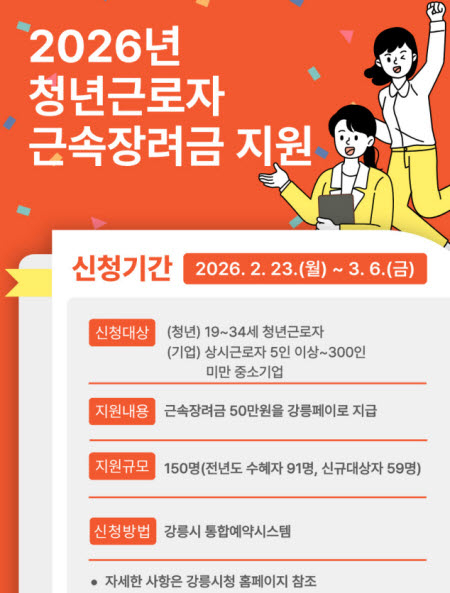 근속장려금 신청은 오는 23일부터 3월 6일까지이며, ‘강릉시 통합예약시스템’을 통해 청년 근로자 본인이 신청하면 된다. 사업에 대한 자세한 사항은 강릉시청 누리집 게시판에서 확인할 수 있다.