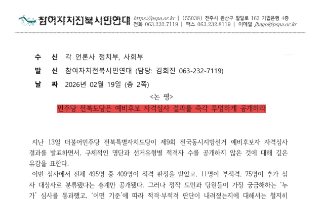 참여자치전북시민연대는 "공천의 공정성은 '비공개'가 아니라 '투명성'에서 나온다"며 "명확한 자격심사 기준을 공개하고 그 기준에 따른 결과를 투명하게 밝히는 것이야말로 경선의 신뢰를 높이는 길"이라고 주장했다.