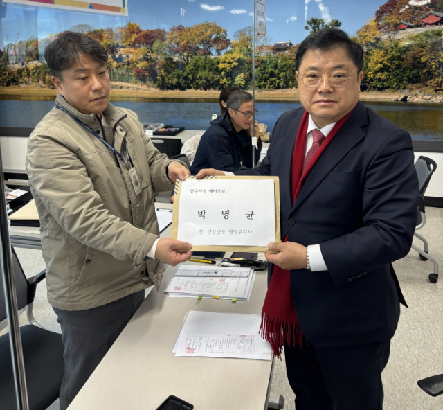 박명균 전 경상남도 행정부지사가 20일 제9회 지방선거 진주시장 예비후보 등록을 1호로 마치며 본격적인 선거 행보에 나섰다.