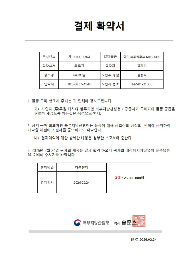 특히 개당 250만 원 상당의 소화기를 일반 법인을 통해 180만 원에 구매할 수 있다며, 차액은 업체가 갖고 소화기만 북부지방산림청에 납품하면 된다고 속여 즉시 입금을 요구했다.