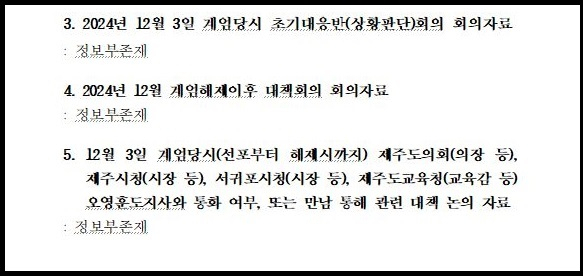 ▲제주도가 계엄 당시 초기 대응반 및 긴급 대책 회의 회의 자료 공개 내용.ⓒ제주도