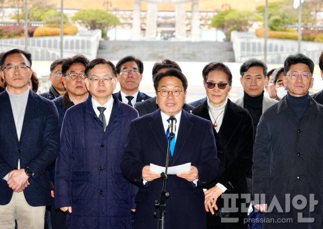 강기정 시장 등 광주광역시 간부들과 공공기관장들은 2일 북구 국립5·18민주묘지를 참배한 뒤, 민주의문 앞에서 통합특별법 국회 통과 환영 입장문을 발표했다.