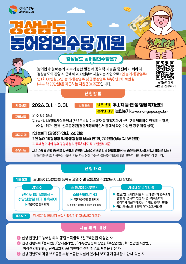 창녕군은 3월 1일부터 3월 31일까지 '2026년 농어업인수당' 신청을 접수한다고 밝혔다. 이번 사업은 농어업인의 공익적 기능을 보전하고 농가 소득 안정을 도모하기 위해 추진된다.