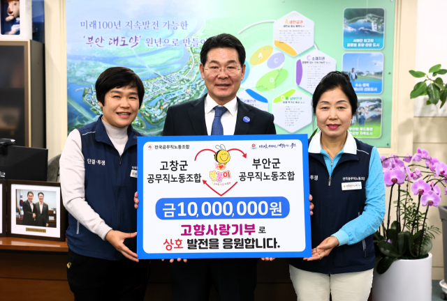 같은 날 부안군청에서 열린 기부 실천 자리에는 부안군 공무직 노조 이말순 지부장과 고창군 공무직 노조 최선례 지부장을 비롯해 양측 노조 간부진이 함께했다.