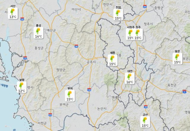이날 낮 최고기온은 대전 14도, 세종·청주·천안 15도, 아침 최저기온은 -2도 수준에 머물면서 15도 안팎의 일교차를 보이겠다.
