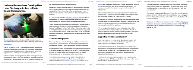 강원대학교(총장 정재연) 춘천캠퍼스(캠퍼스총장 임의영) 자연과학대학 화학과 정영미 교수와 강원방사선융복합연구지원센터 진실아 전임연구원은 미국 뉴욕주립대학교 올버니캠퍼스(University at Albany)의 알렉산더 셱트만(Alexander Shekhtman)·이고르 레브네브(Igor K. Lednev) 교수와 국제공동연구를 통해 ‘mRNA 기반 치료제의 품질을 비파괴적으로 정밀 분석할 수 있는 차세대 레이저 분광 기술’을 개발했다.
