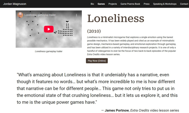 이러한 노력 중 하나가 "게임 포엠(Game poem)" 운동이다. '시'를 뜻하는 '포엠(poem)'이 들어간 이 개념은 산업주의, 소비주의, 자원 소모와 연관되어온 기존의 '게임(산업)' 개념에서 벗어나, 게임을 마치 시(poem)처럼 성찰과 문화적 비평차원에서 사유하는 환경을 추구하자는 의미를 지닌 운동이다. 게임 포엠들은 간단한 설치 또는 인터넷 주소 입력을 통해 플레이가 가능하며, 플레이 시간도 5-10분 정도로 매우 짤막한 것들이 대부분이다. 누구나 게임을 즐기고 또 나아가 누구나 게임을 만들 수 있다는 것을 증명하는데 주안점을 두고 있기에, 주제와 내용도 개발자의 개인 주관이나 경험을 토대로 한다. 게임 포엠의 시초라 할 수 있는 작품은 검은색 블록과 간단한 방향키 만으로 고독을 절묘하게 묘사한 Jordan Magnuson의 작품, "외로움(Lonliness)" (2011년작)이다. (링크: https://www.jordanmagnuson.com/games) 개발자가 한국에서 영어 강사로 근무하던 시절 목격한 왕따 현상을 모티브로 한 이 작품은 이후 '미니멀 게임' 나아가 '게임 포엠' 운동을 시작하는 계기가 되었다. 이후 10여 년 간 '게임 포엠'은 실험적 영역에서 이리저리 시도 되다가, 최근 (앞서 언급한) 유럽의 이런저런 사정과 높아지는 언더독, 기술민주화에 대한 열망을 계기로 점차 관심을 얻기 시작해 최근엔 아예 "게임 포엠 매거진" 창간으로 이어졌다. (링크: https://www.gamepoems.com/)