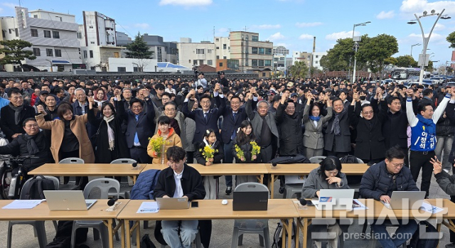 ▲문대림 의원이 7일 오후 3시 제주시 탐라문화광장에서 도지사 출마 선언을 하고 있다.ⓒ프레시안