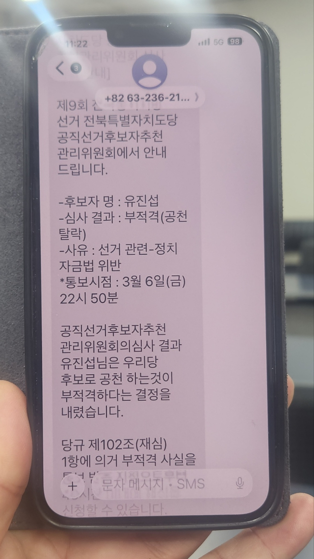 유 전 시장은 "민주당 전북도당이 이 같은 결과를 당사자들이 반발이나 대응을 못하도록 한밤중에 휴대전화 문자를 이용해 보낸 것이 아니겠느냐"며 해당 문자메시지를 공개하는 등 강하게 반발했다.
