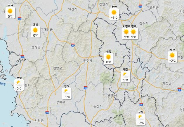 이날 낮 최고기온은 대전 11도, 세종·청주·천안 12도로 예상되며 아침 최저기온은 -1도 안팎을 기록할 것으로 보인다.