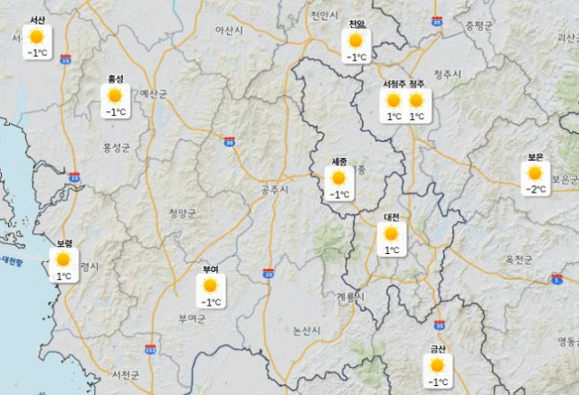 이날 낮 최고기온은 대전·천안 11도, 세종·청주 12도로 예보됐으며 아침 최저기온은 -1도 안팎에 머물 것으로 전망된다.