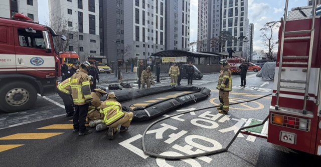 훈련에는 소방공무원과 아파트 관계자 등 19명과 소방 펌프차 등 장비 7대가 동원됐으며, 아파트 주차장에서 전기차 화재가 발생한 상황을 가정해 진행됐다.