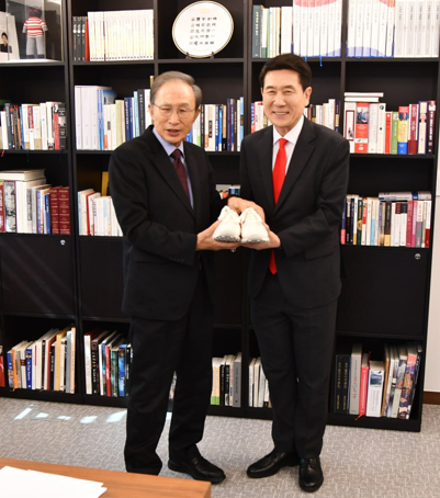 이 전 대통령은 또 “여론이 많이 올라온 것으로 알고 있다. 끝까지 열심히 뛰어 반드시 승리하라”며 국내 스포츠 브랜드 ‘프로스펙스’ 운동화를 선물했다.