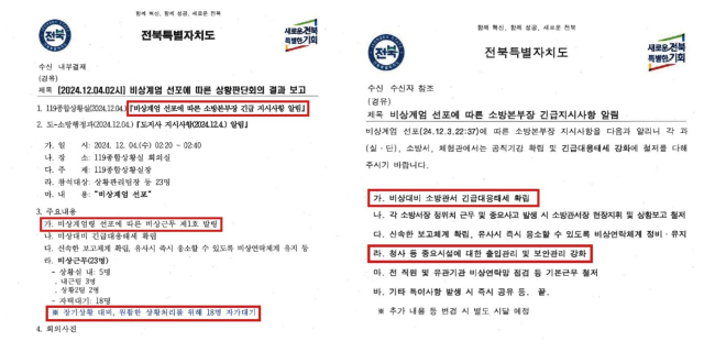 그가 공개한 ‘비상계엄 선포에 따른 소방본부장 긴급지시사항 알림’ 문건에는 ‘비상대비 소방관서 긴급대응 태세 확립’, ‘청사 등 중요시설 출입관리 및 보안관리 강화’ 등의 내용이 담겨 있다.