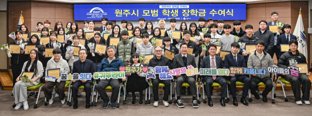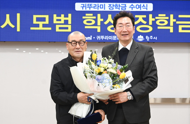 원주시는 17일 귀뚜라미문화재단 장학금 및 장학증서 수여식을 개최하고 예체능 분야에서 재능과 성장 가능성을 보인 지역 중·고등학생 50명에게 장학금을 전달했다.