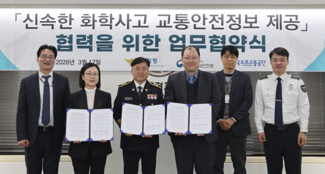 한국도로교통공단(이사장 김희중)과 경찰청(청장대행 유재성), 기후에너지환경부 소속 화학물질안전원(원장 박봉균)은 17일 경찰청 청사(서울 서대문구 소재)에서 화학사고 발생 시 신속한 교통안전정보 제공을 통해 지역주민의 신속한 대피를 지원하고 2차 피해를 예방하기 위한 업무협약을 체결했다.