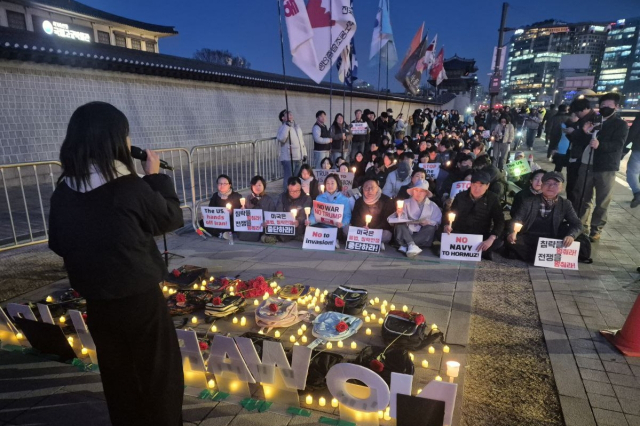 미국과 이스라엘의 이란 침공이 3주째로 접어든 19일 저녁, 서울 도심에 '전쟁 반대', '파병 반대'를 외치는 시민들이 촛불을 들고 모였다. 도널드 트럼프 미국 대통령이 한국 정부에 호르무즈 해협 군함 파견을 요구한 뒤 처음 열린 반전집회였다.