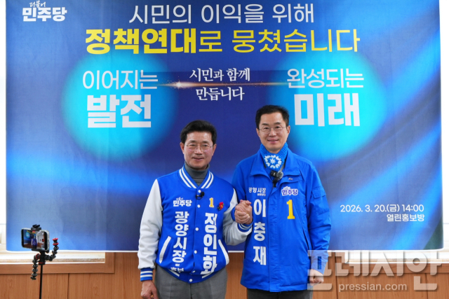 전남 광양시장에 출마한 정인화 예비후보와 이충재 예비후보가 20일 '정책 연대'를 선언하며 손을 잡았다.