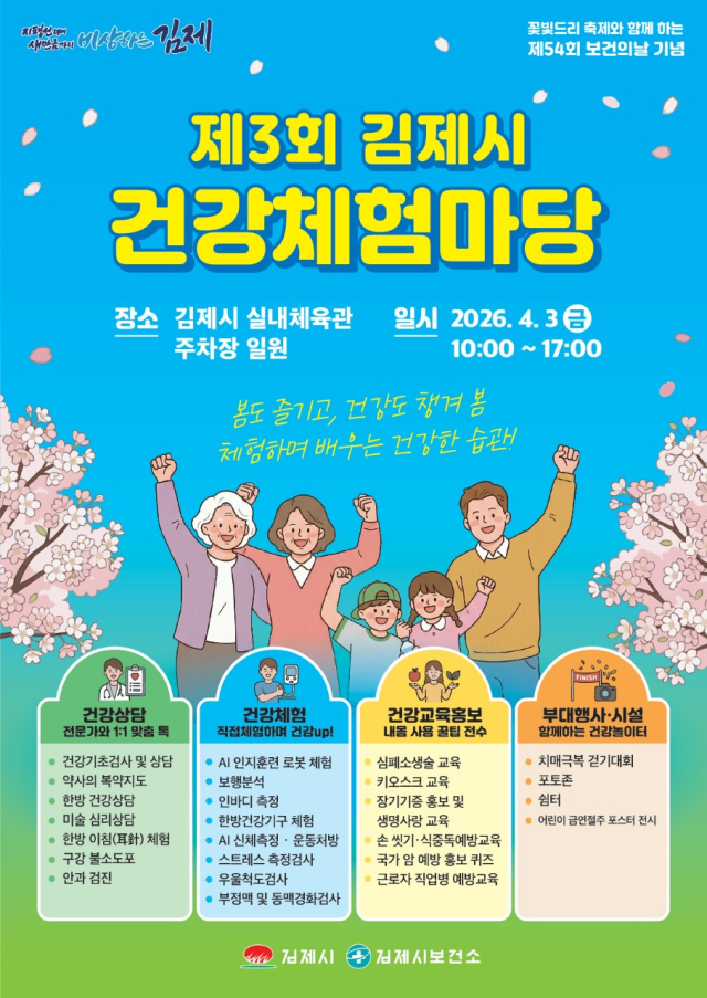 전북자치도 김제시가 오는 4월 3일 제54회 보건의 날을 기념해 시민들의 일상 속 건강 실천 문화를 확산하기 위한 ‘제3회 김제시 건강체험마당’을 김제시 실내체육관 주차장 일대에서 개최한다.
