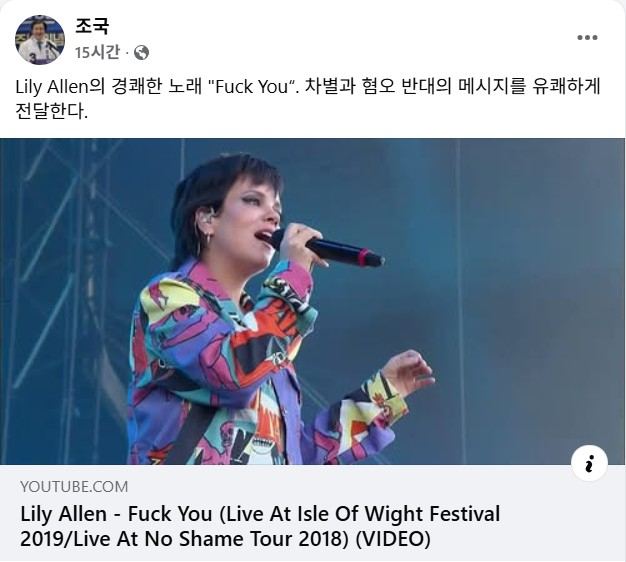 조 대표는 해당 프로그램이 방송된 뒤 자신의 페이스북에 욕설이 섞인 해외 팝송 영상을 올렸다. 그는 "Lily Allen의 경쾌한 노래 "Fuck You"라며 한 페스티벌에서 해당 노래를 부르고 있는 가수 릴리 앨런의 영상을 첨부했다. 그러면서 "차별과 혐오 반대의 메시지를 유쾌하게 전달한다"고 덧붙였다.
